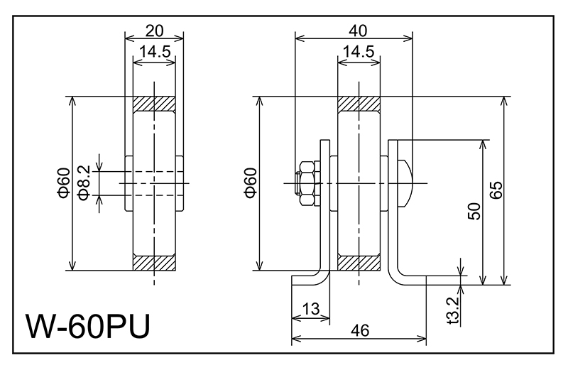 | W-60PU | 60x14.5x8.2x20 | M8x35L | 50x46x13x40x3.2 | 65 | 1800 · 2400 · 3000 | 75 · 100 · 150 · 200 | 50 | جف | PU |