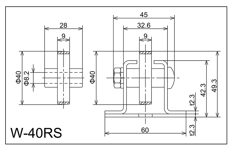 | W-40RUS | 40x9x8.2x28 | M8x40L | 42.3x60x32.6x45x2.3 | 49.3 | 1800 · 2400 · 3000 | 50 · 75 · 100 · 150 | 30 | j | PU |